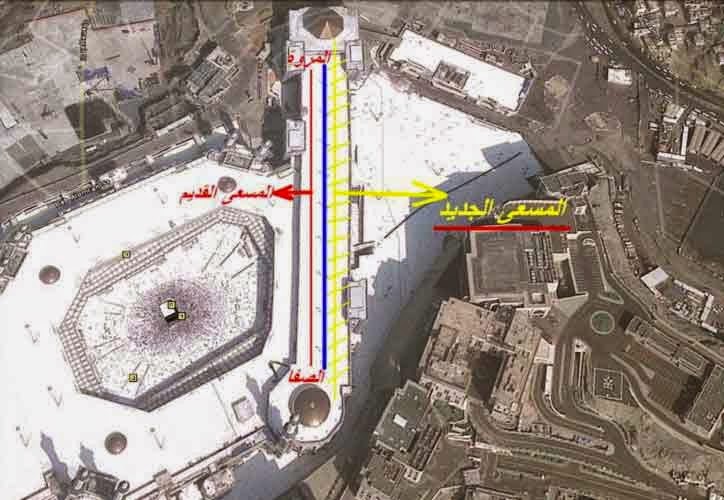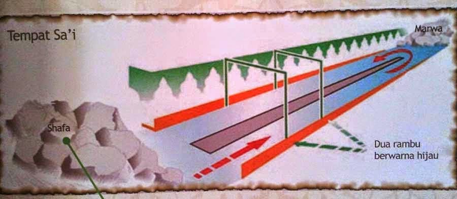 Dari bukit Safa ke bukit Marwah, dibaca mulai dari bukit Safa sampai pilar hijau pertama.
